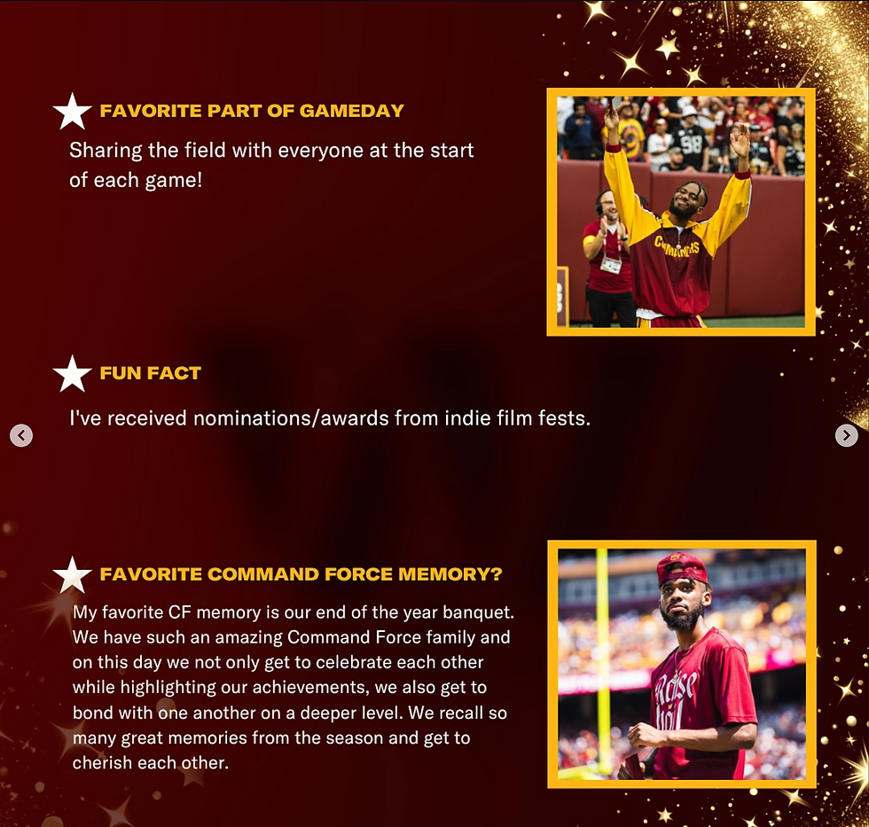 is a dynamic and versatile professional, excelling in NFL dance performance, choreography, creative direction, and film production. With a career spanning over a decade, Brandon currently performs as a high-profile dancer for the Washington Commanders, helping the team achieve top rankings in Game Entertainment Satisfaction and multiple growth metrics. His work has garnered industry recognition, including being a Finalist and Official Selection at the ARFF Paris International Awards 2022 and winning Best Set Design at the Universal Movie Awards 2021.
